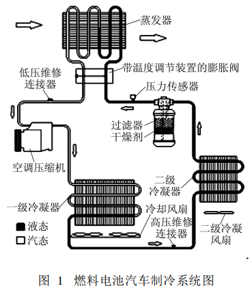 FCV热管理系统包括制冷系统和冷却水系统。图1是 “863”项目中 FCV的制冷系统图, 该系统由压缩机、一级冷凝器、二级冷凝器、带温度调节装置的膨胀阀、蒸发器、冷却风扇、制冷剂管路等组成。与前期设计不同的是 ,该系统增加了二级冷凝器。一级冷凝器与二级冷凝器串联以实现FCV空调系统散热量大的要求。冷凝器的散热采用空冷式散热,一级冷凝器增加了一个高压风扇,二级冷凝器自带风扇。制冷系统是一个密封的循环系统, 其中充有制冷剂 R134a。黑色管路中走的是液态制冷剂, 白色管路中走的是气态制冷剂。