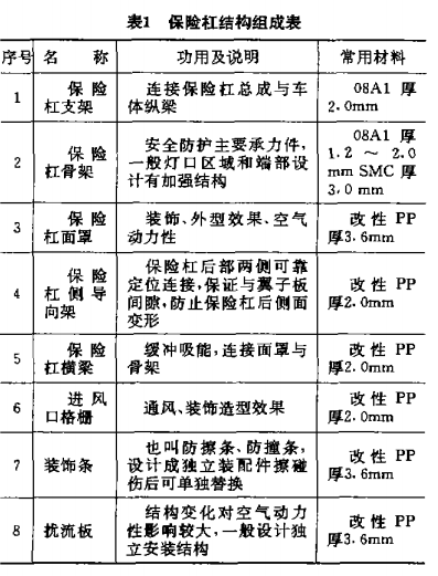 一般轿车、中小客车多采用后两种型式的保险杠。保险杠的结构组成如图1所示及表1说明。