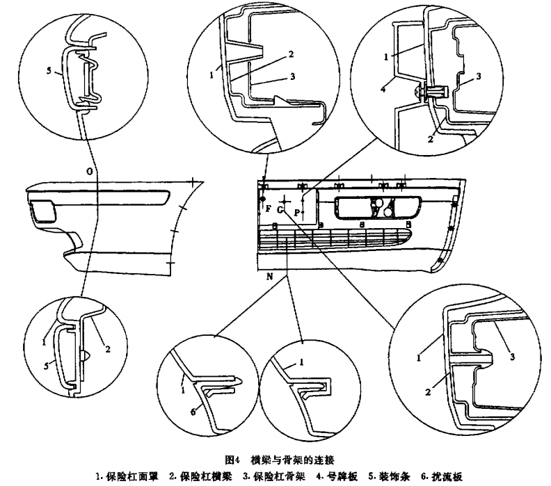 如图4、图5所示,N剖面为扰流板与面罩的连 接,沿接触处一周搭接和卡子型式;O剖面为独立式 装饰条与面罩的连接、卡接结构;P剖面为号牌板与 面罩通过支架的连接方式;Q剖面为进风口格栅整 体和独立的两种型式;L剖面为灯具与保险杠结构件的连接配合关系。