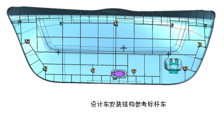 1)后背门护板本体结构设计构想:设计车结构及按装点形式可以参考标杆车进行设计,如图所示 。