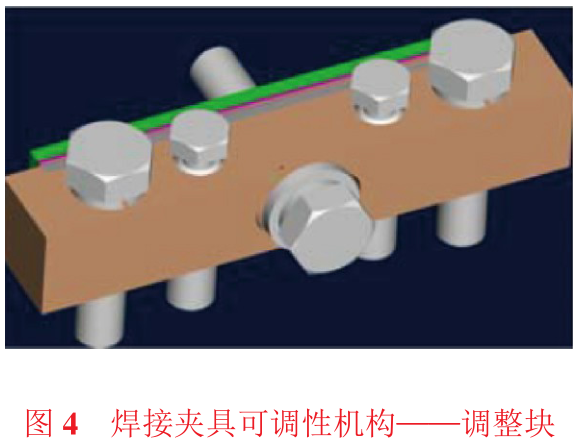 使用此种可调性机构的注意事项:1)严格禁止在2 层联结之间的不同位置塞入不同厚度的垫片,致使定位元件的位置取决于螺钉拧紧程度,大大降低焊接夹具的可靠性和工作稳定性。定位调整机构的各组调整垫片的调整方向要与总成图内标注的方向一致,便于确定调整量;2)根据每个产品特性,均需设计 1 层调整机构,而这层调整机构要设计 1 组调整块,一般是 2 块调整块。根据经验,应设计成多自由度调整机构,调试周期比普通调试周期缩短一半。
