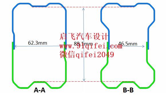由断面可知,标杆车A/B/C柱都采用的是空腔结构,为的是加大其截面面积,增大结构刚度,内部也设计了加强板,加固结构增大强度。